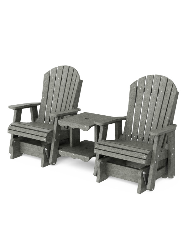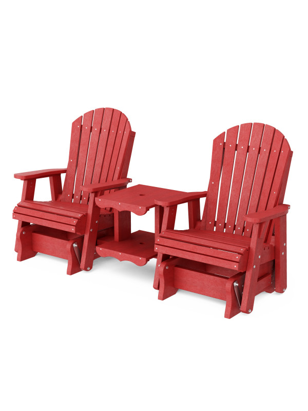 The Heritage Double Rock-A-Tee offers a unique and convenient twist to outdoor seating. Each glider features an Adirondack-inspired design with comfortable contours. The central addition is perfect for holding beverages, snacks, or your favorite book. Built from heavy-duty poly lumber, this set withstands the elements and requires minimal maintenance. Choose from a variety of vibrant, fade-resistant colors and enjoy a 20-year warranty for lasting peace of mind.
