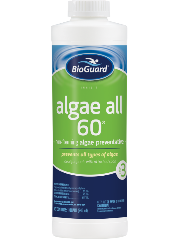 Algae All 60® is a non-foaming algae preventative. Weekly use prevents algae before its starts. It is suitable for use in pools with attached spas, waterfalls, or decorative fountains. It complements most sanitizers. Algae All 60® is a highly effective algae killer and algae preventative.