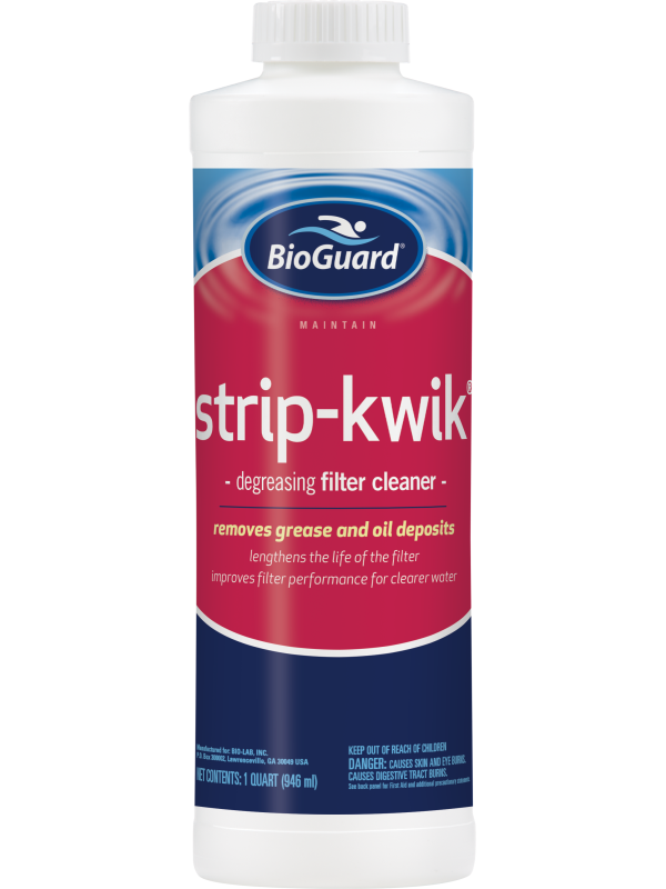 BioGuard® Strip-Kwik® removes oil and grease from any type filter. Proper filtration and chemical treatment are equally important in maintaining good swimming pool water. Body oils and suntan lotions, which collect in the pool filter, reduce the filter’s efficiency. Use of this product promotes better filtration, lengthens filter cycles, and reduces maintenance costs. This product should be used twice each season for residential pools and every six weeks in heavily-used pools and commercial pools.